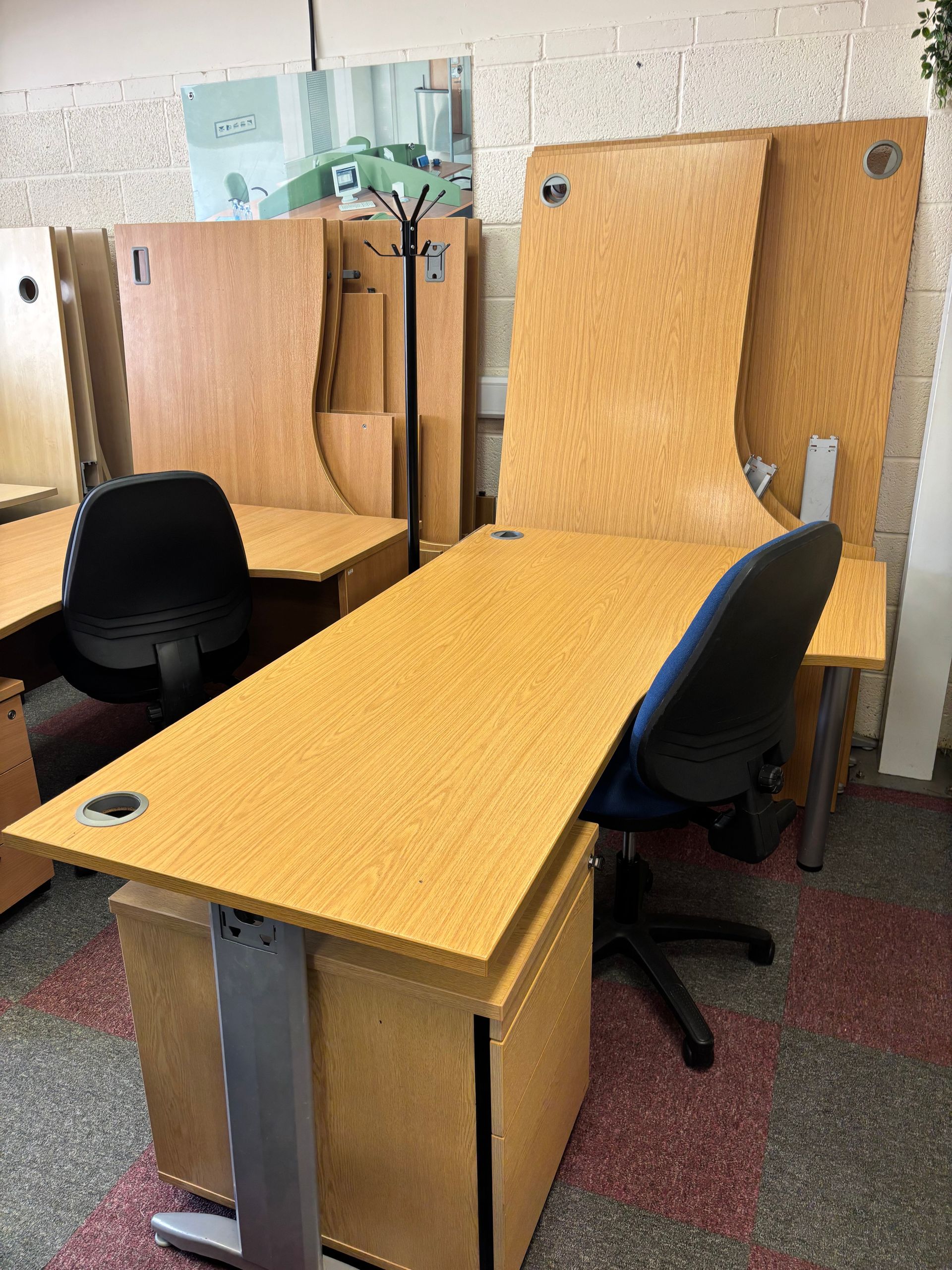 Curved desk 1600 mm in oak with metal legs and cable tray