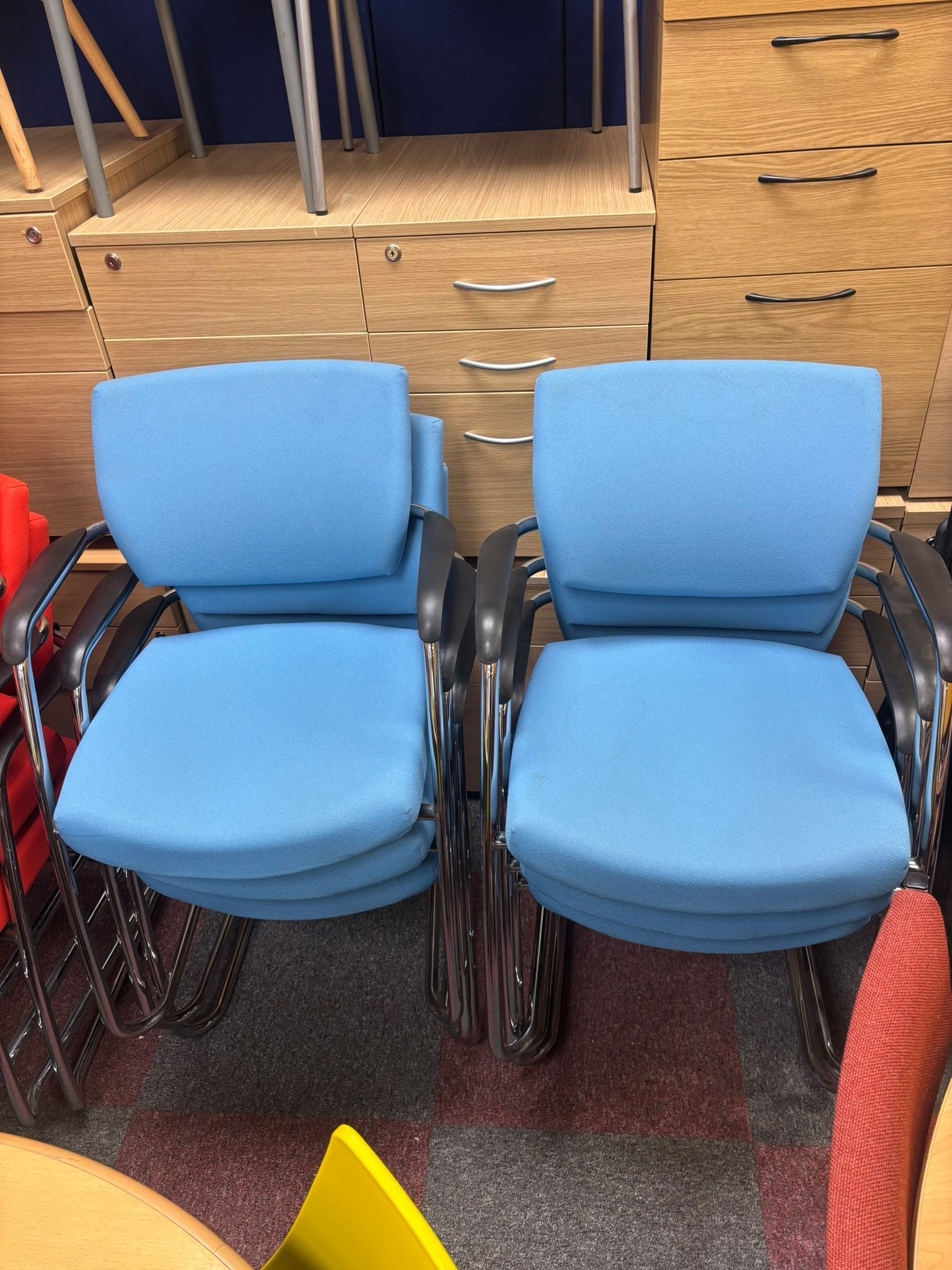 Used stackable meeting chairs in light blue with silver cantilever frame and arms